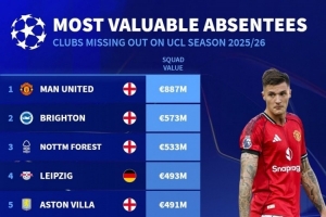 华体会app-缺席欧冠球队身价榜:曼联8.87亿欧居首,布莱顿次席&米兰第六